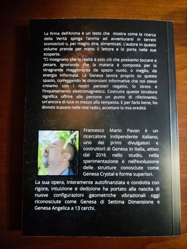La firma dell’ Anima è il titolo del mio primo libro, un testo che racchiude gli ultimi 10 anni di sperimentazione e ricerca nel campo della Genesa cristallo e Pentasfera.